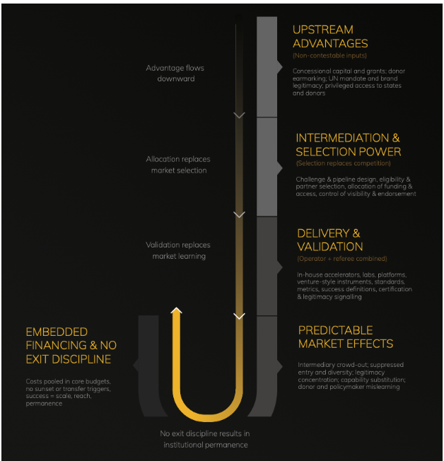 In many LMIC contexts, the combined effect is non-contestability. Domestic intermediaries may exist, but they cannot compete on equivalent terms when an institution has: global brand legitimacy, donor access, privileged proximity to ministries and procurement channels, and limited exposure to “failure disciplines” (bankruptcy, market exit, mandate loss). Innovation ecosystems mature through learning-by-doing and competitive variety; a single dominant gateway suppresses entry and narrows pathways to scale.